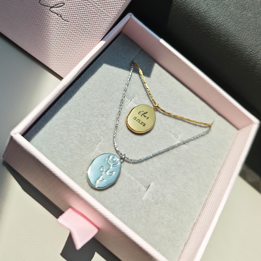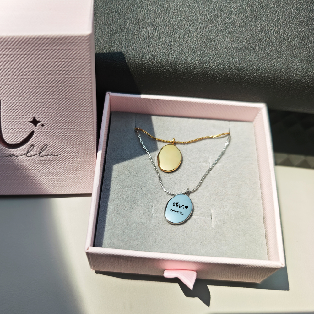 ความพิเศษของสร้อยเส้นนี้คือ สามารถสลักชื่อ ข้อความ หรืออักษรพิเศษที่ด้านหลังจี้ได้ ทำให้เครื่องประดับชิ้นนี้ไม่ใช่เพียงแค่สร้อยคอ แต่ยังเป็นของขวัญที่มีความหมายเฉพาะตัว เหมาะสำหรับมอบให้คนสำคัญในโอกาสพิเศษ